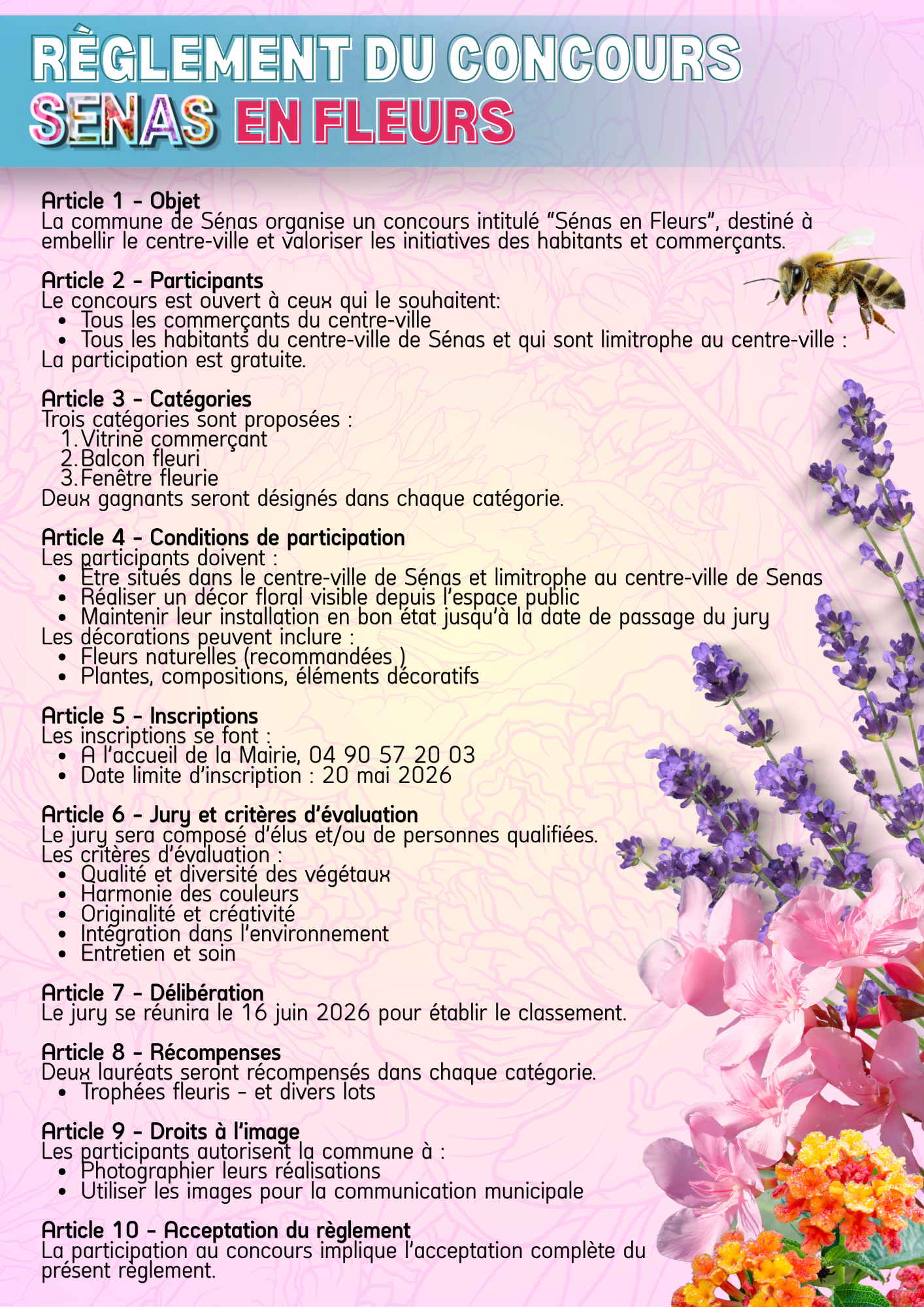 Consultez le règlement en cliquant juste ici : https://www.senas.fr/wp-content/uploads/2026/04/Concours-Senas-en-fleurs.png