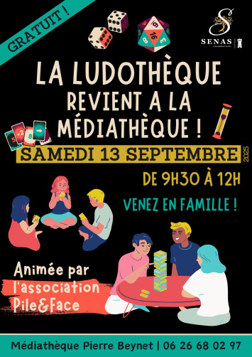 Samedi 13 Septembre, de 9h30 à 12h, la ludothèque revient à la Médiathèque Pierre Beynet !