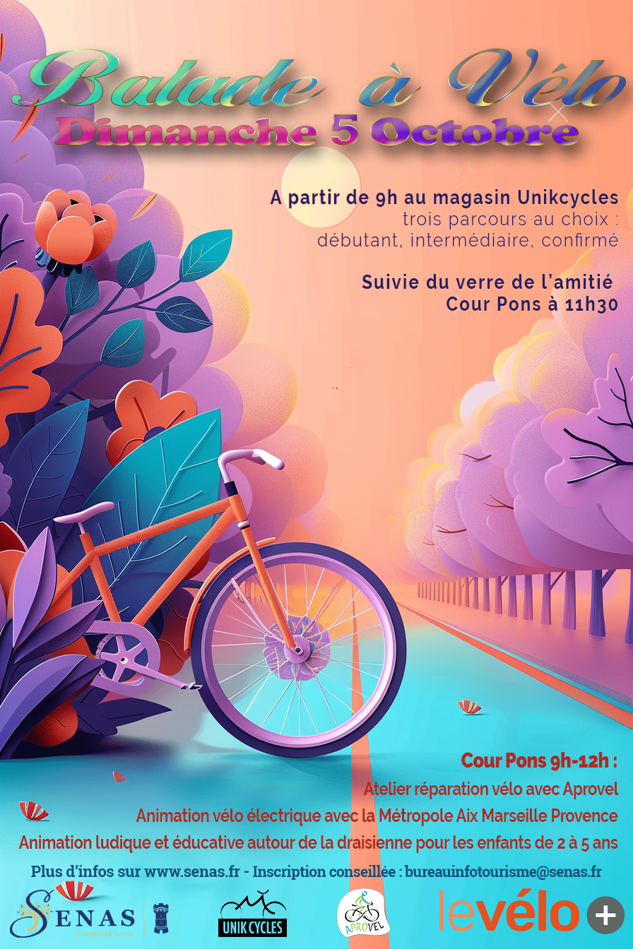 Le Dimanche 5 Octobre, Balade à vélo à Sénas. Cour Pons de 9h à 12h : Atelier réparation vélo avec Aprovel Animation vélo électrique avec la Métropole Aix Marseille Animation ludique et éducative autour de la draisienne pour les enfants de 2 à 5 ans A partir de 9h au magasin Unikcycles trois parcours au […]