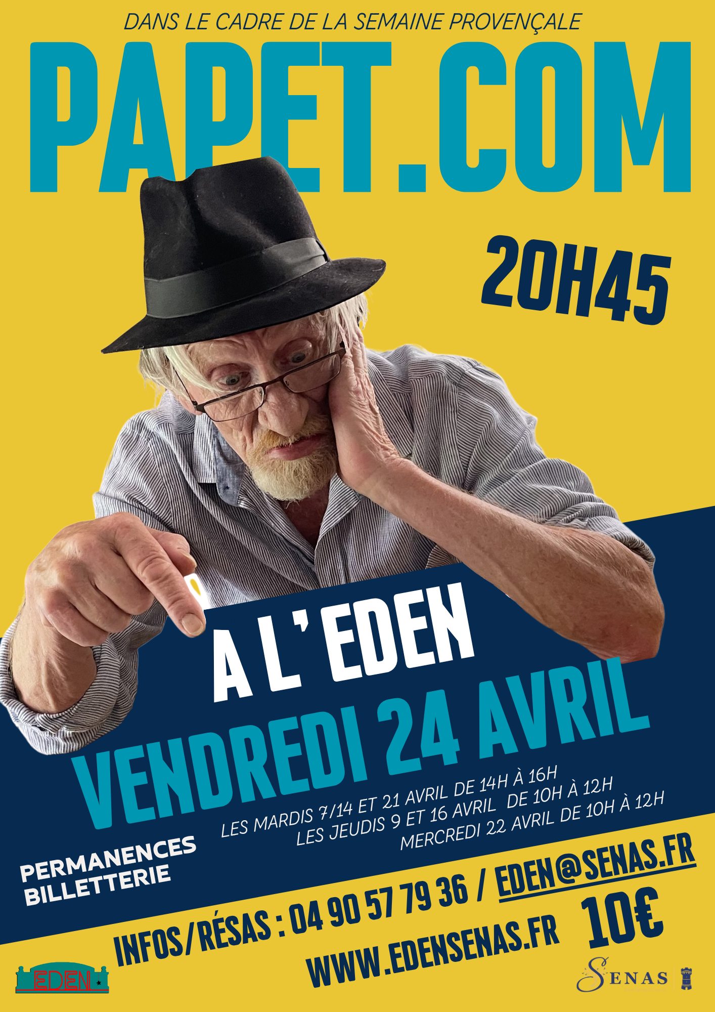 Papet.com Vendredi 24 Avril, 20h45 à l’Eden Tarif 10€ Infos et réservations : 04 90 57 79 36 / eden@senas.fr